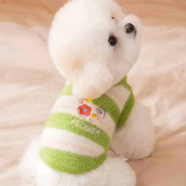 Wrap your little companion in snug, cheerful comfort with this striped knit pet sweater. Designed for small dogs and cats, it blends soft wool warmth with a playful embroidered flower for a look that turns winter walks and couch cuddles into pure joy. Lightweight yet cozy, this two-leg sweater keeps your pet’s chest and front legs warm while leaving the back legs free for easy movement. It’s the perfect mix of cute, comfy, and practical.