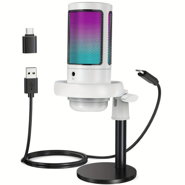 Bring studio-style sound to your desk with this USB condenser microphone designed for gamers, streamers, and everyday creators. Whether you are live streaming, gaming with friends, recording content, or joining online meetings, this microphone delivers clear, focused audio that makes your voice sound natural and confident. The modern design, paired with immersive RGB lighting, adds a bold visual upgrade to any setup while keeping everything simple and easy to use.
