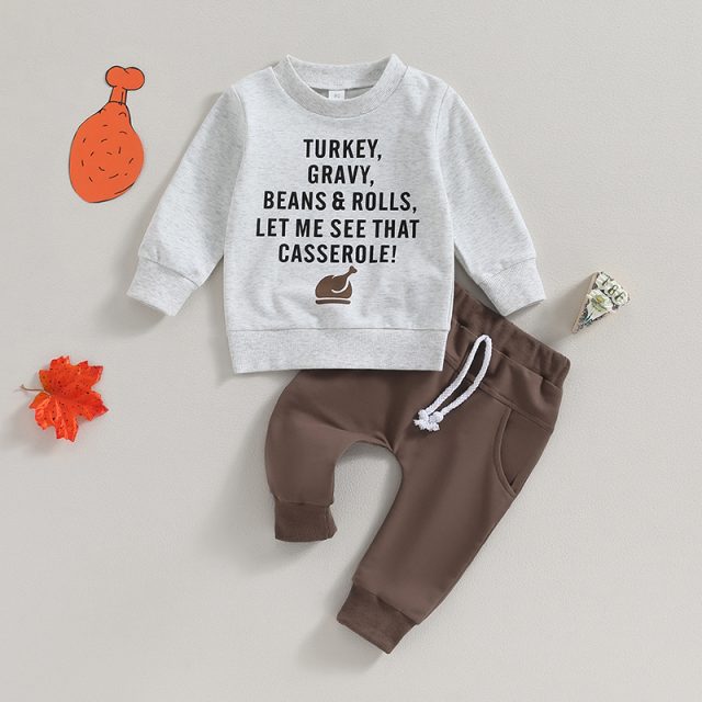 Baby Boy Thanksgiving Outfits. This charming set includes a classic long-sleeve sweatshirt featuring a playful turkey print and matching pants. Perfect for family gatherings, cozy evenings at home, or a fun outing, this outfit combines comfort and style, ensuring your toddler looks adorable while feeling cozy all season long.