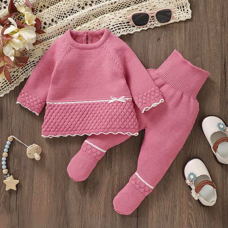 This baby clothes set features a lovely knit sweater dress paired with matching trousers that include a foot-wrap design to keep tiny toes warm. The solid-color pattern gives it a timeless look, making it ideal for daily wear, family outings, or photo sessions. With its pullover O-neck design and full-length sleeves, dressing your baby becomes simple and fuss-free.