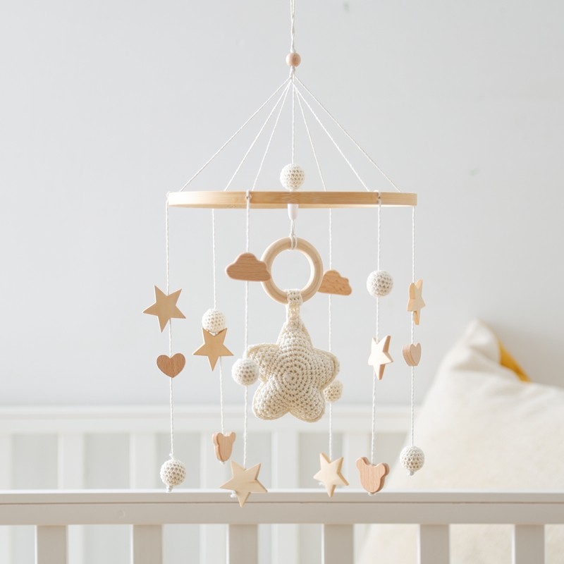 Wooden Baby Crib Mobile with Crochet Stars & Musical Rattle Toys