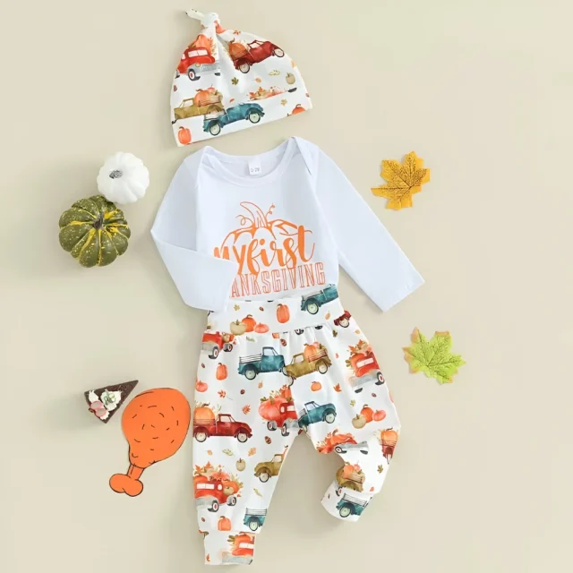 Make your little one the star of Thanksgiving with this adorable 3-piece fall outfit set designed for both baby boys and girls. Featuring a cozy long-sleeve romper with a festive letter print, charming pumpkin car print pants, and a matching hat, this set perfectly captures the warmth and joy of the holiday season. Soft, stretchy, and oh-so-cute, it’s the ideal choice for your baby’s first Thanksgiving photos, family gatherings, or autumn outings.