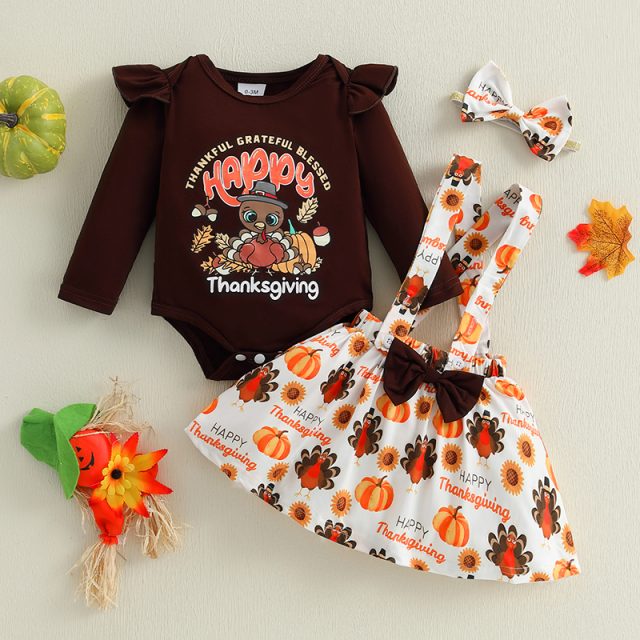 Get your little one ready for the festive season with this charming Baby Girls Thanksgiving Outfit Set! This delightful set includes a cozy long-sleeve romper with a fun print, a stylish turkey-printed suspender skirt, and a matching headband. Perfect for family gatherings, holiday photos, or just adding some festive cheer to everyday wear, this outfit is sure to make your baby girl the star of any event!