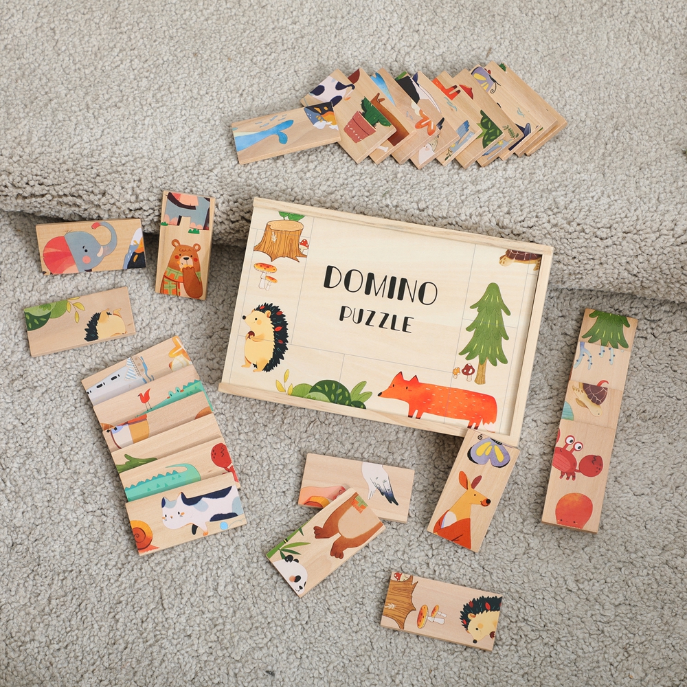 Baby Montessori Wooden Animal Domino Puzzle & Building Blocks – Educational Balance Toy