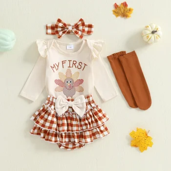 Baby Girl Thanksgiving Outfit Romper Set with Plaid Shorts & Accessories