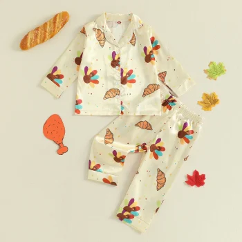 Girls Thanksgiving Turkey Print Pajama Set – Long Sleeve Button-Up Sleepwear