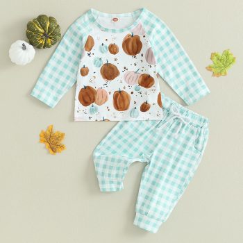 Cute Baby Boys Pumpkin Print Shirt & Plaid Pants Set – Cozy Fall Outfit
