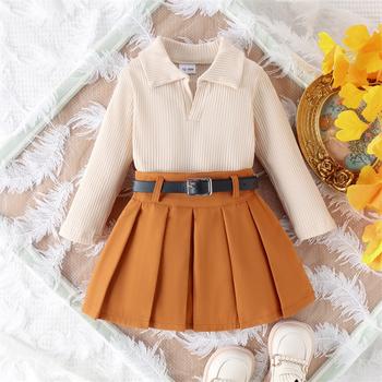Kids Fall Outfit Long Sleeve Top with Pleated Skirt & Belt Set
