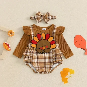Baby Girl Thanksgiving Turkey Plaid Romper & Headband Set – Fall Outfit