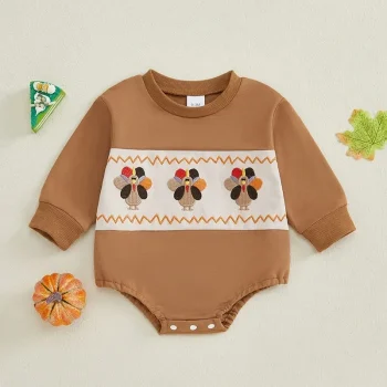 Autumn Thanksgiving Turkey Embroidered Baby Romper – Cozy Fall Outfit for Infants