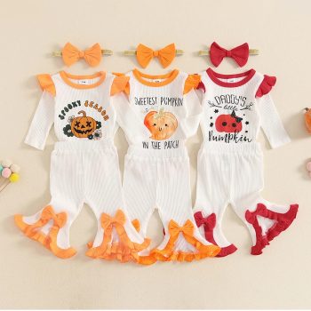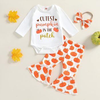 Baby Girl Cute Pumpkin Outfit 3-Piece Set with Romper, Flare Pants & Bow