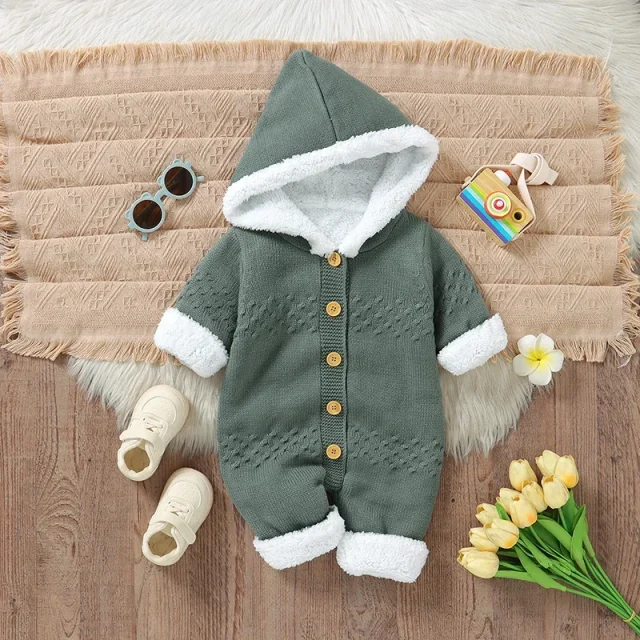 This winter-ready romper stands out with its knit fabric, hooded collar, and easy single-breasted closure. The fleece lining offers extra insulation, making it ideal for autumn and winter weather. The solid-color design adds a clean, timeless look suitable for both boys and girls. True-to-size fitting ensures a comfortable and secure feel while allowing your baby to move freely. With lengths starting at approximately 22 inches, it’s thoughtfully sized for newborns through growing infants.