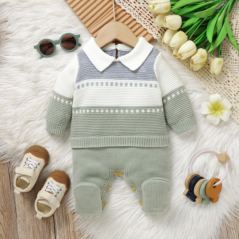 Cozy Knit Baby Romper – Unisex Striped Jumpsuit with Turn-Down Collar