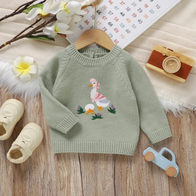 Wrap your baby in comfort and charm with this cozy knit baby sweater, designed for infants and toddlers up to 3T. Made from soft acrylic yarn, it feels gentle on delicate skin while keeping your little one warm through chilly days. The playful embroidered duck adds a touch of sweetness, making this pullover an instant favorite for everyday wear, family outings, and photo-worthy moments. Whether you’re dressing your child for a cool morning stroll or a cozy afternoon indoors, this sweater brings both style and comfort to their wardrobe.