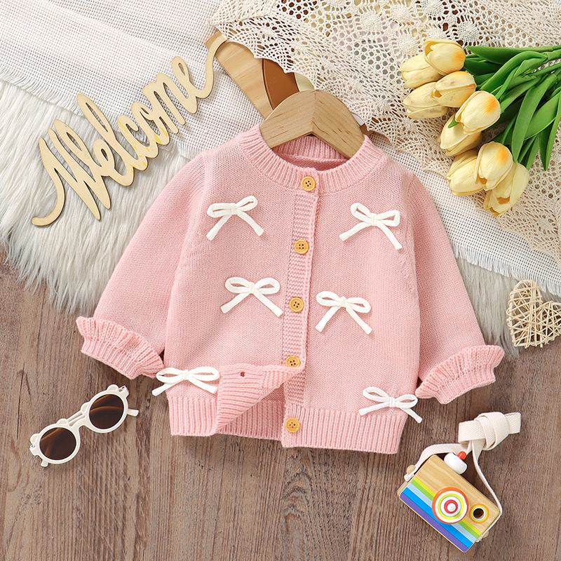 Wrap your baby girl in warmth and charm with this adorable knit baby cardigan. Designed with love and care, this long-sleeve sweater brings together comfort and fashion in one cozy piece. Crafted from soft, breathable acrylic, it feels gentle on delicate baby skin while providing just the right amount of warmth for cool autumn and winter days. The solid color design with cute 3D bows and ruffled details adds a sweet touch that makes every outfit look picture-perfect.