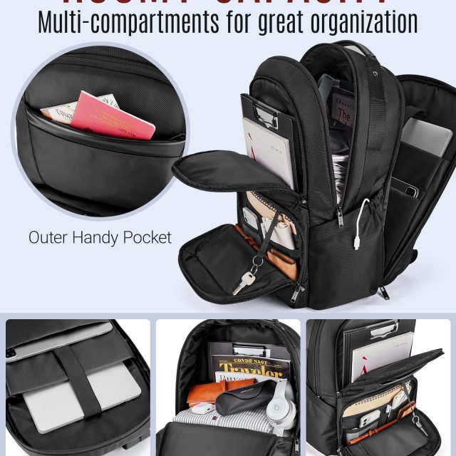 This multifunctional backpack is designed to carry everything you need with ease. The separate laptop compartment fits laptops up to 17.3 inches, along with a 12.9-inch tablet, keeping your devices safe and secure. Multiple compartments and handy side pockets provide organized space for books, clothes, files, and smaller essentials like keys, wallet, and glasses. Plus, the built-in USB charging port ensures your phone stays powered up on the go.