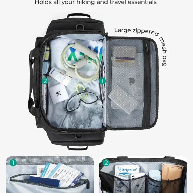 A rugged main compartment (16″ x 8.4″ x 9″) handles heavy-duty daily use, while a waterproof side pocket keeps your phone or wallet safe from sweat and spills. The ventilated shoe compartment fits Size 12 footwear and keeps odors separate from clean gear.