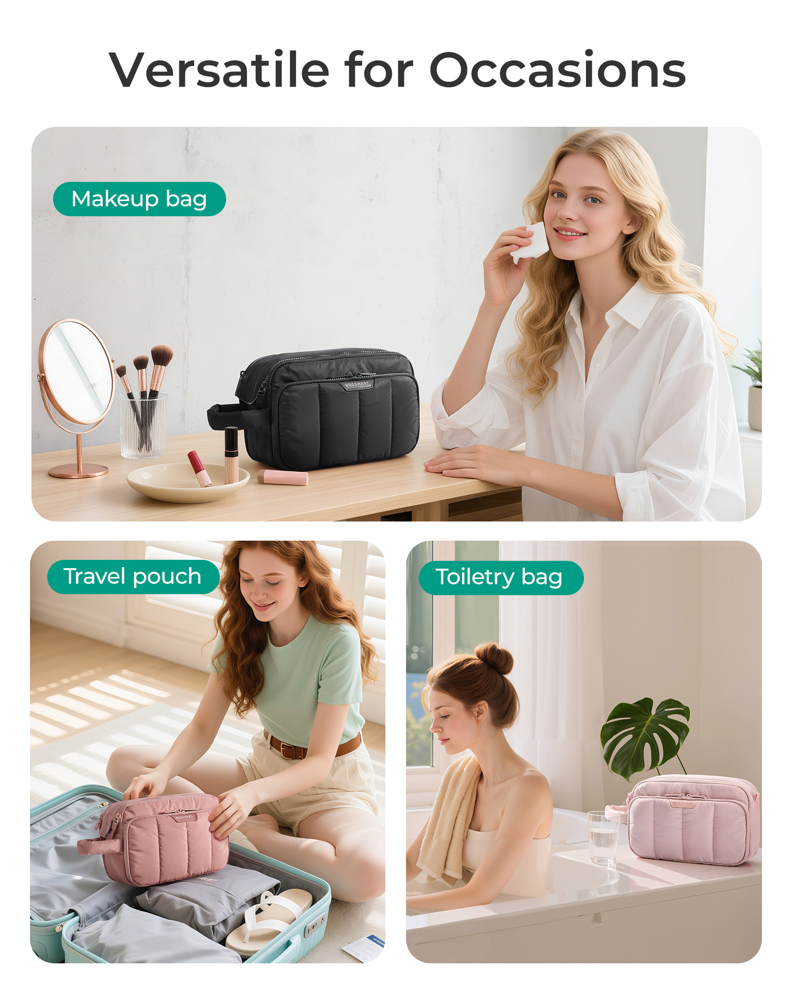 Stay organized, stress-free, and stylish wherever you go. This travel makeup organizer is designed to keep all your beauty and toiletry essentials perfectly in place. With a smart interior layout and a soft, puffy exterior, it combines function and comfort in one must-have travel accessory. Whether you’re packing for a weekend getaway, a long vacation, or simply organizing your daily essentials at home, this bag makes everything easier and more enjoyable.