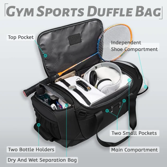 Designed with the modern man in mind, this waterproof duffel gym bag is the ultimate solution for organizing your workout gear, travel essentials, and everyday items. Whether you’re packing for the gym, a weekend getaway, or a business trip, this bag ensures that everything stays in its place, clean, and dry. The inclusion of a shoe compartment allows you to keep your footwear separate, while the wet and dry compartments make sure that damp gym clothes or towels don’t mix with your dry clothing and electronics. No matter where life takes you, this bag is up to the challenge!