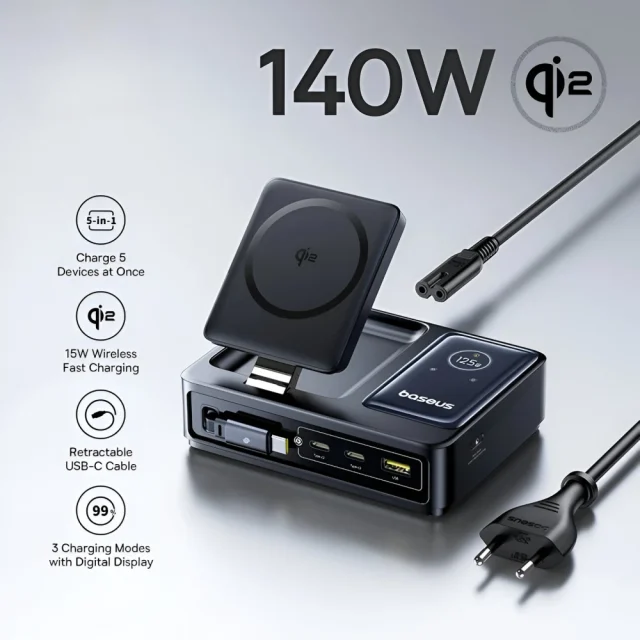 Unlike ordinary chargers, this desktop hub combines wired and wireless charging with advanced power distribution modes and a clear digital display. Its sleek design, retractable cable, and 140W high-speed output redefine convenience. No more swapping plugs or waiting turns — just plug, power, and perform.