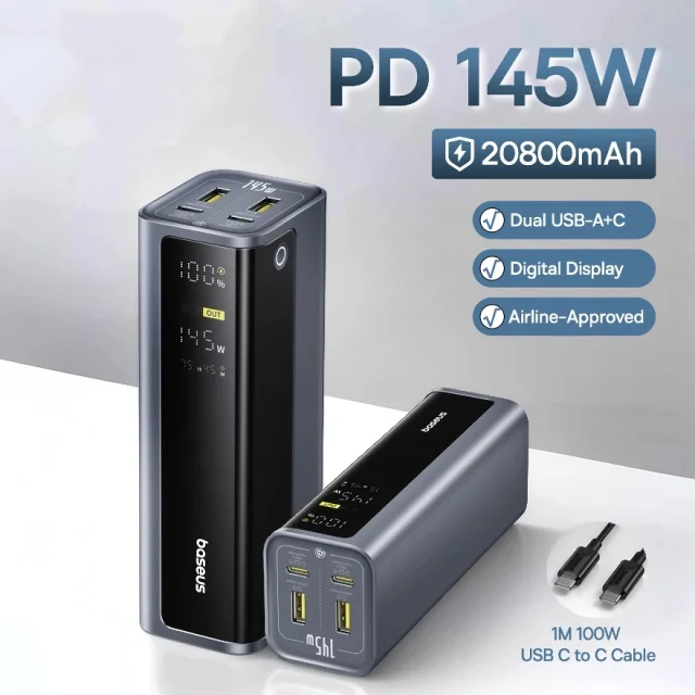 This power bank features a massive 20800mAh capacity, making it perfect for long days away from outlets. It supports up to an impressive 145W total output, allowing you to charge laptops, tablets, phones, and gaming devices efficiently. Dual USB-C and dual USB-A ports let you power up to four devices at once without slowing down.
