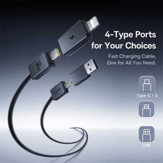 With dual-head, four-port versatility, this innovative cable combines USB-C and Lightning connectors, allowing you to charge multiple devices seamlessly. Enjoy PD 60W high-speed charging that powers phones, tablets, and laptops efficiently — perfect for busy professionals, travelers, and multitaskers.