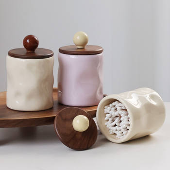 Vintage Ceramic Cotton Swab Storage Box with Walnut Lid