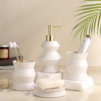 Elegant 4-Piece White Ceramic Bathroom Set – Lotion Dispenser, Tooth Cup, Soap Dish & Brush Holder
