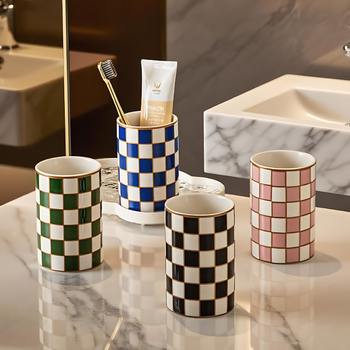 Elegant Plaid Ceramic Toothbrush & Makeup Brush Holder Cup