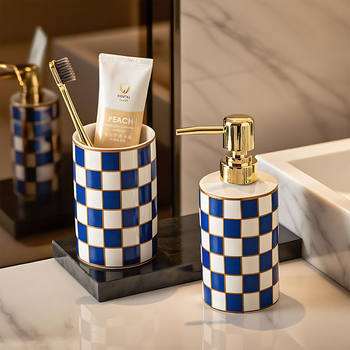 Black & White Checkered Ceramic Soap Dispenser & Bathroom Organizer Set