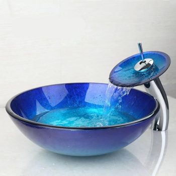 Blue Chrome Waterfall Glass Basin Sink Set with Tall Mixer Faucet