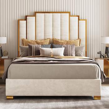 Modern Velvet Upholstered Platform Bed with Tall Gold Trim Headboard