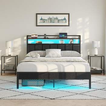 Metal Bed Frame with Headboard, LED Lights, Storage & Charging Station