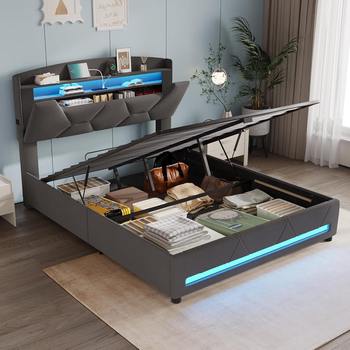 Full Lift-Up Storage Bed Frame with LED Lights & Charging Station