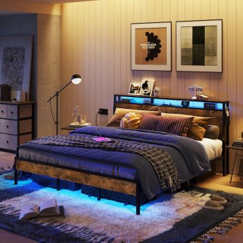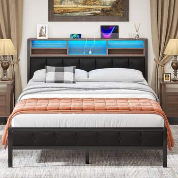 Queen Size LED Bed Frame with Headboard, Storage & Charging Station