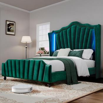 Queen Size Velvet Platform Bed Frame with LED Lights
