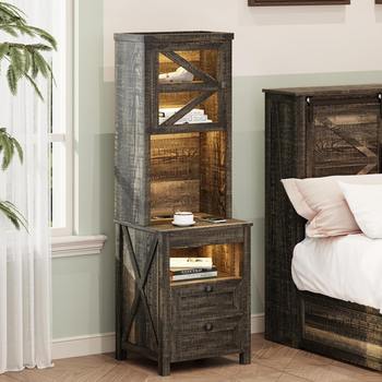 Farmhouse Tall Nightstand with LED Light & Charger Station
