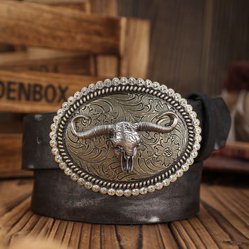 Western Cowboy PU Leather Belt with Bull Buckle & Floral Engraving