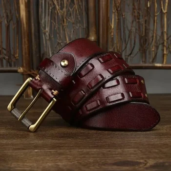 3.8CM Genuine Leather Belt with Luxury Brass Pin Buckle – Vintage Braid Strap