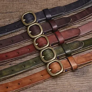 Women’s Genuine Cowhide Leather Belt with Copper Buckle – 0.9 Inch Retro Slim Waistband