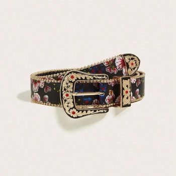 Women’s Black Palace-Style Belt with Ruby Buckle & Beaded Floral Edge