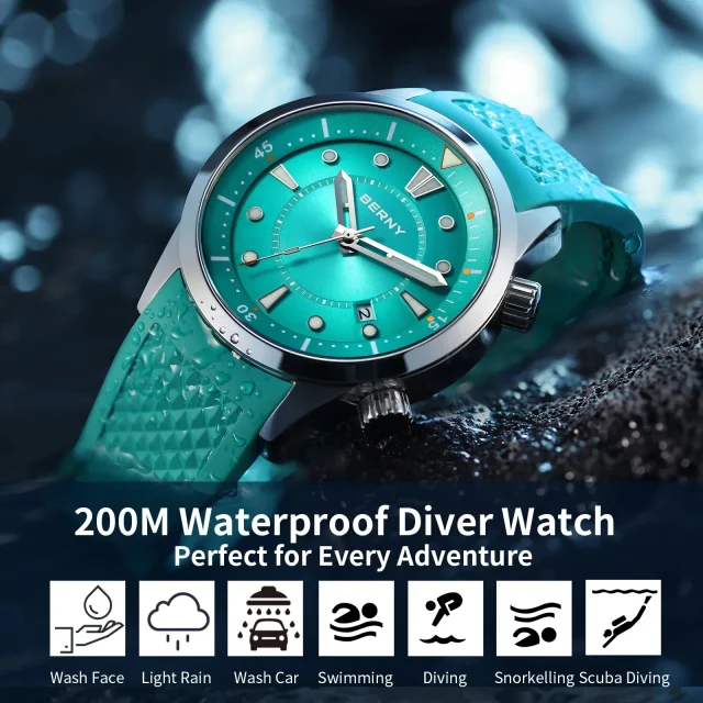 Designed for up to 660 feet (200 meters) of water resistance, this watch is ideal for swimming, snorkeling, and scuba diving. The dual-crown design, including a timing crown at 2 o’clock, controls the internal rotating bezel for accurate dive tracking. Super luminous hands and markers ensure easy visibility in total darkness, while the sapphire glass and exhibition back offer scratch resistance and clarity from every angle.