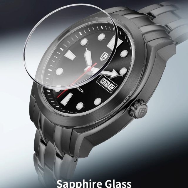 Built with scratch-resistant sapphire glass on both the front and back, this watch stays pristine through daily wear. The exhibition caseback showcases the precision of its automatic self-winding movement, powered by kinetic energy—no batteries required. With a 41mm case diameter and a comfortable 7.5-inch (190mm) strap length, it fits perfectly on the wrist, offering a balanced blend of style and substance. The stainless-steel folding safety clasp ensures a secure fit and easy wearability throughout the day.
