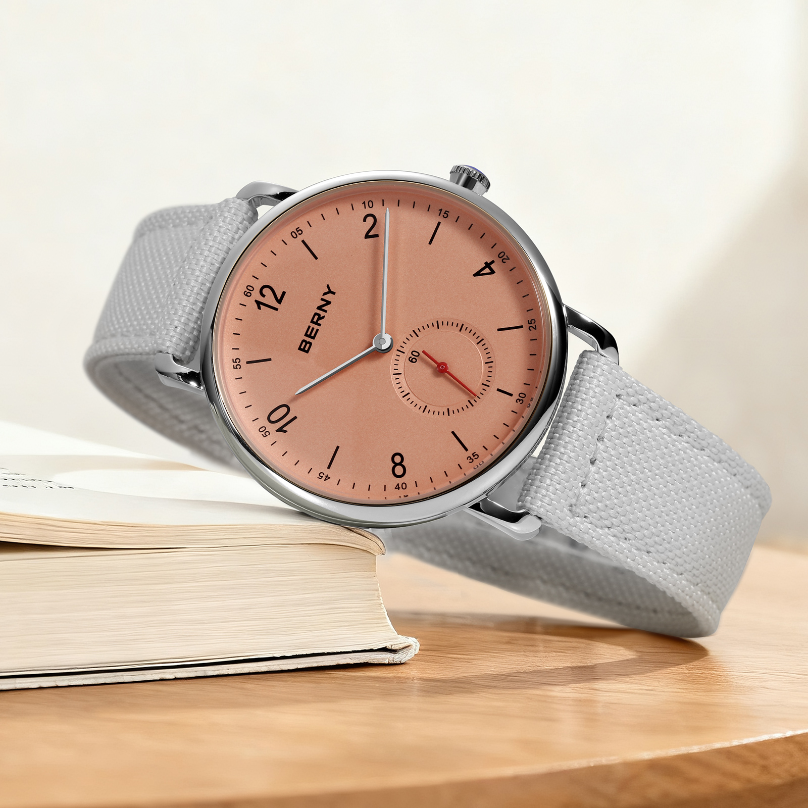 This men’s wristwatch features a matte sandblasted dial with bold Arabic numerals and a clean seconds sub-dial for easy legibility. The quick-release strap allows simple customization to match your mood or outfit, while the double safety buckle ensures it stays securely in place during your busiest days.