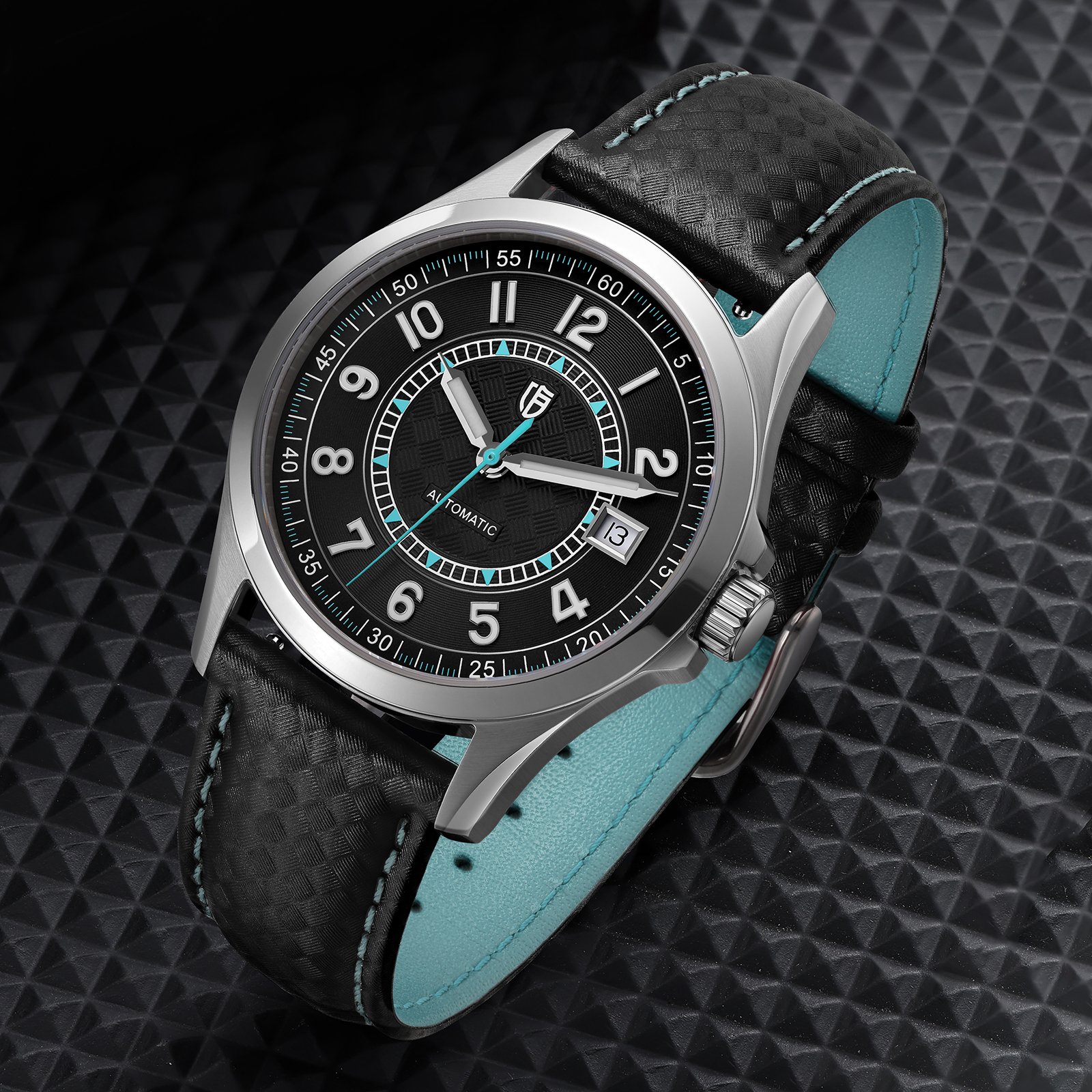 Featuring a round stainless steel case measuring 1.5 inches in diameter and 0.45 inches thick, this watch is both compact and bold. The scratch-resistant sapphire crystal lens and transparent sapphire back showcase its mechanical beauty while ensuring lasting clarity. A genuine leather strap with a carbon fiber texture adds a touch of refinement, offering both comfort and strength for daily wear.