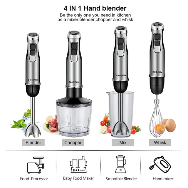 Transform your kitchen routine with this 4-in-1 High-Power Hand Blender, designed for ultimate performance and convenience. Featuring a robust 1200W motor and durable stainless steel ice-crushing blades, it’s built to handle everything from silky soups to frozen fruit smoothies with ease. Whether you’re whipping up creamy sauces, blending baby food, or crushing ice for a refreshing drink, this versatile hand blender makes every task quicker, easier, and smoother.