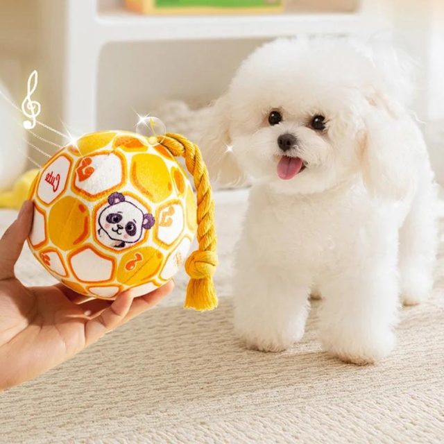 This interactive dog toy is more than just a ball — it’s a complete play experience. The unique knot design encourages your dog to chew, helping clean teeth and massage gums. A built-in squeaky bell adds excitement with every bite, sparking curiosity and keeping boredom at bay. The soft PP cotton filling offers comfort and bounce, while the vibrant yellow and blue colors make it easy to spot during playtime.