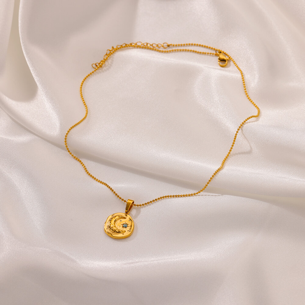 Elevate your style with this stunning Blue Zircon Star Moon Necklace, designed to add a touch of elegance and sophistication to any outfit. Perfect for women who love classic yet unique jewelry, this necklace features a dazzling blue zircon gemstone set against a shining gold stainless steel chain. Whether you are dressing up for a wedding, a special event, or simply want to add some sparkle to your everyday look, this necklace is the ideal choice.