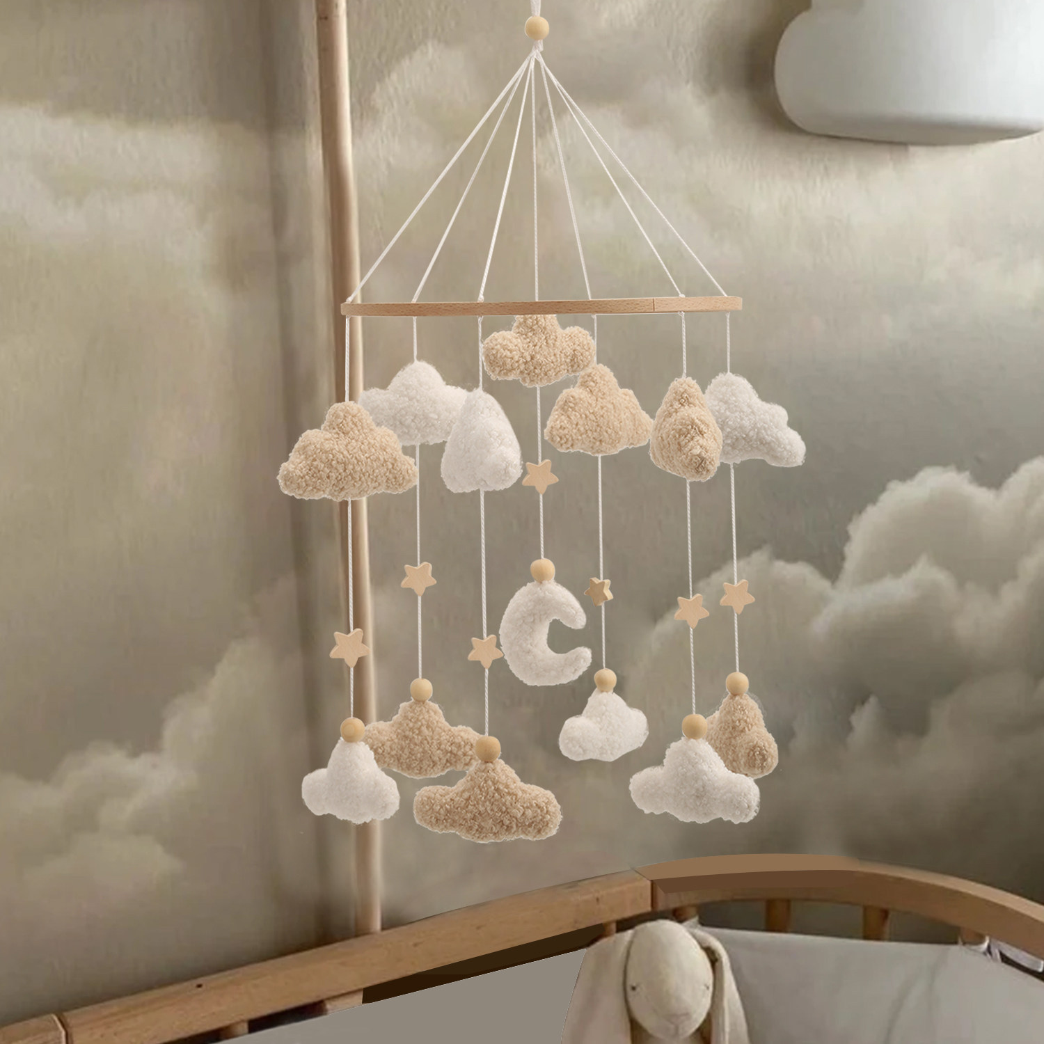 Create a peaceful and comforting atmosphere with this neutral moon and cloud baby mobile, designed to gently soothe and delight your little one. With its soft boucle-inspired look and calming neutral tones, this mobile blends beautifully into any nursery style, from modern and minimalist to cozy and classic. It’s more than just decor, it’s a thoughtful piece that supports your baby’s early development while adding warmth and charm to their space.