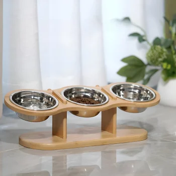 Adjustable Wooden Pet Bowl Stand with 3 Stainless Steel Bowls for Cats & Dogs